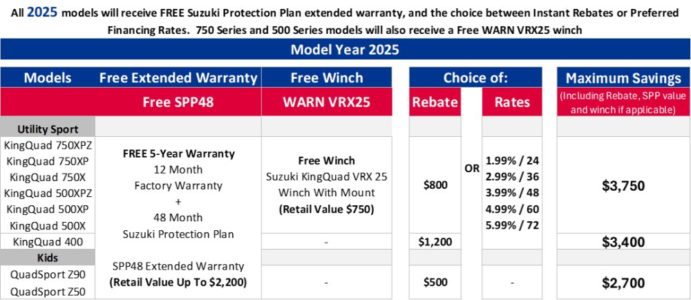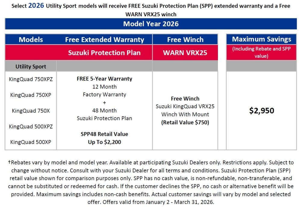 - FREE Warn VRX25 winch with 2025/2026 KingQuad 750 and 500 models.
